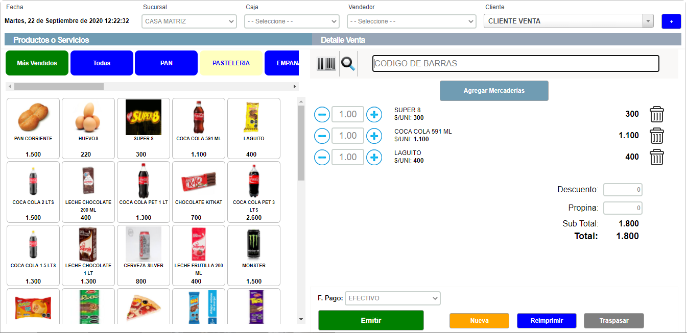 Sistema intuitivo y dinámico de ventas que permite generar boletas electrónicas automáticas, puede ser operado con pantalla táctil y lector de códigos de barras además de entregar reportes de ventas, cajas, consultas de stock, documentos electrónicos emitidos, etc.