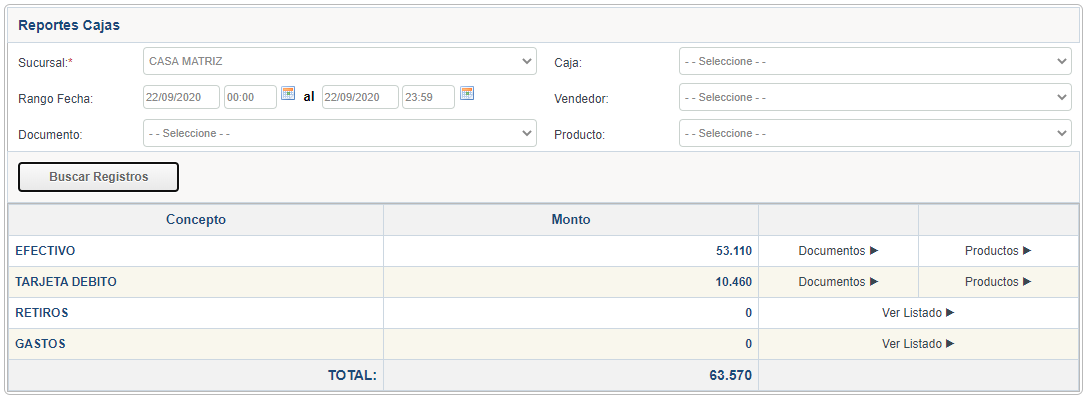 Entrega información detallada de las ventas y retiros de caja según variados parámetros como: sucursal, caja, rango de fecha y hora, documento, artículo, forma de pago, etc.