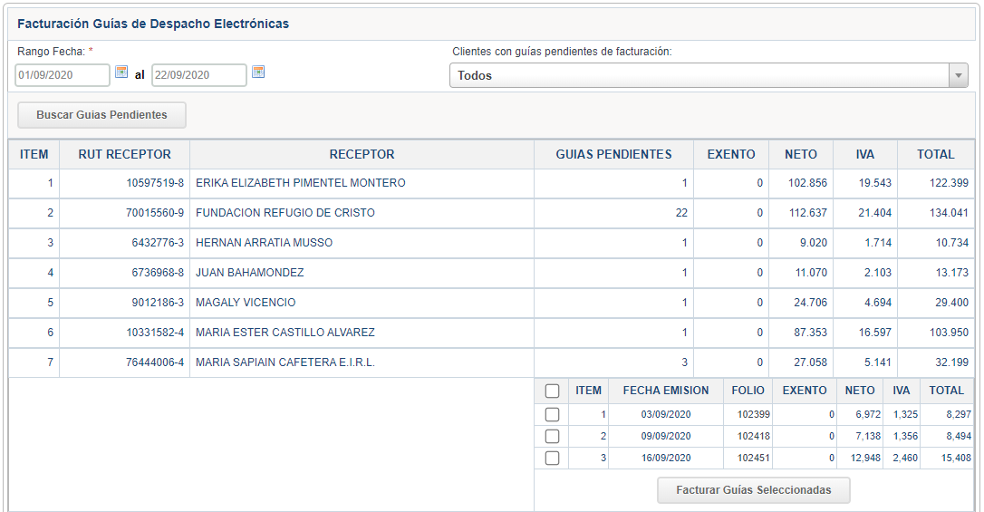 Módulo que permite agrupar y posteriormente facturar electrónicamente las guías facturables emitidas, este proceso se puede realizar por rango de fecha y fitrar por cliente.